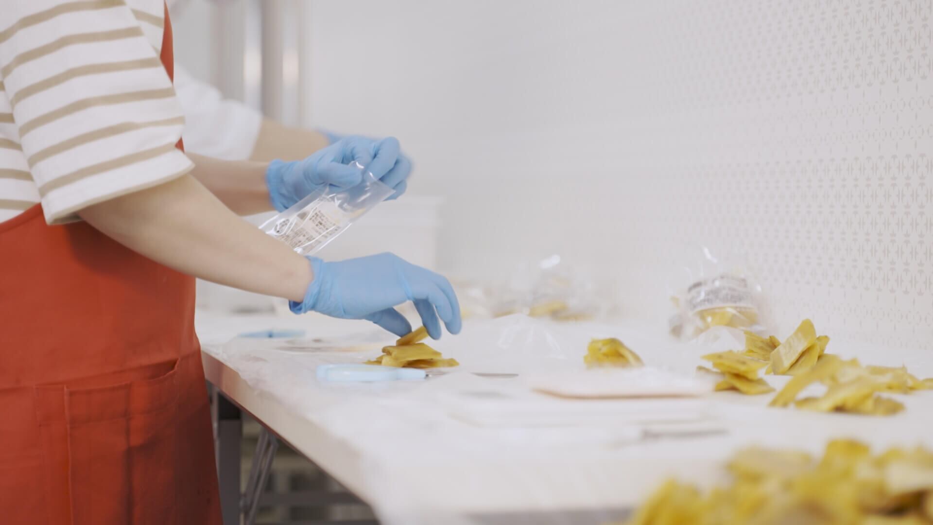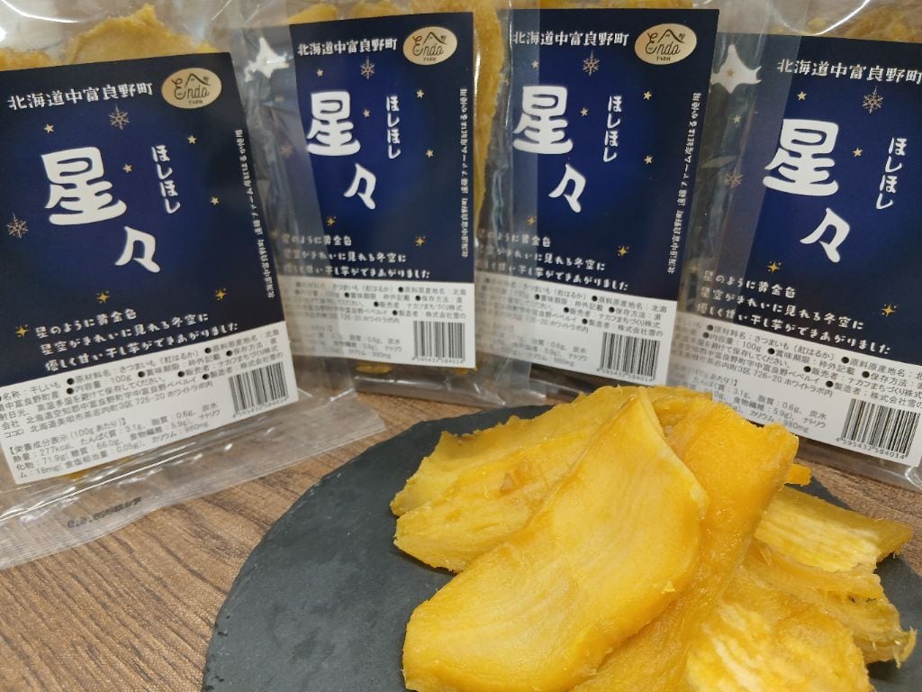 「星々」は、中富良野産のさつまいも(紅はるか)を丁寧に干し上げました。自然の甘みを最大限に引き出すため、適切な温度と湿度でじっくりと水分を飛ばし、食感や味わいにこだわりました。しっとりした柔らかさと、ほんのり甘い味わいが特徴です。